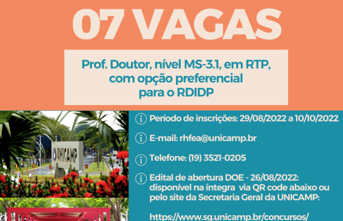 Author FEA-Suporte Published on: 18 de setembro de 2022 Concurso Docente FEA Unicamp – 07 vagas Concurso para Prof. Doutor nível MS-3.1, em RTP, com opção preferencial para o RDIDP.